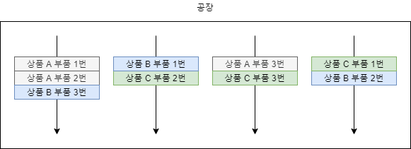 상품 A를 조립하다가 B를 조립했다가 다시 A를 조립했다가 C를 조립한다.
